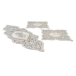 ابعاد ست رومیزی 5 تکه جواهردوزی: 1 عدد رانر بزرگ 31x81 (2±) سانتیمتر، 1 عدد رومیزی جلومبلی 36x36 (2±) سانتیمتر و 3 عدد رومیزی جلو مبلی 20x20 (2±) سانتیمتر.