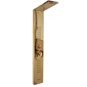 پنل دوش مدل E شرکت آرامان با رنگ مشکی مات و لوازم طلایی ، دارای بدنه استیل ضد زنگ 304 ss (بهترین و مقاوم ترین آلیاژ موجود) است. دارای 5 حالت پرتاب (پاشش) کاربردی به شکل مجزا و لوازم درجه یک می باشد. این پنل دوش وارداتی جز بهترین و با کیفیت ترین پنل های موجود در بازار جهانی است.
