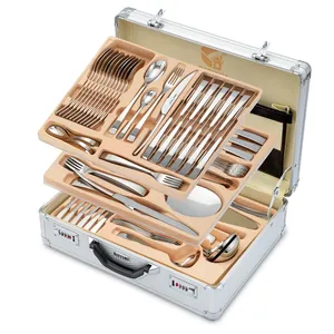 سرویس قاشق و چنگال ۱۲ نفره ۵۴ تیکه مدل دونا استیل ۱۸/۱۰ شامل ۱۲ قاشق ۱۲ چنگال ۶ مرباخوری ۶شربت خوری ۲کفگیر ۱ملاقه بزرگ ۱ملاقه کوچیک ۲قاشق خورشت همراه با چمدان (رنگ چمدان رندوم انتخاب میشود بین رنگهای کرم و سفید یا نقره ای ) رنگ طلق داخل چمدان بستگی به موجودی دارد و ممکن است کرم یا صورتی باشد