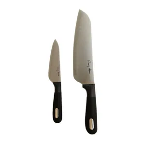مجموعه 2 عددی چاقوی آشپزخانه شامل سایز بزرگ با طول 32 سانتیمتر ( سرآشپز ) ، سایز متوسط با طول 27 سانتیمتر ( همه کاره ) با طراحی روز دنیا و با مواد اولیه مرغوب مناسب خرد کردن سبزیجات ، سیفی جات ،میوه و استفاده روزمره در آشپزخانه می باشد . جنس تیغه این چاقو ها از استنلس استیل ST-420 است که بهترین رده استیل برای ساخت چاقو میباشد که با دارا بودن درصد مناسب کربن باعث ایجاد استحکام مناسب در تیغه این چاقو می شود . جنس دسته از فیبر استخوانی می باشد که بسیار دوام ، استحکام و زیبایی بالاتری از مواد متداول مورد استفاده در چاقوهای دیگر از جمله پلکسی گلس ، چوب ، پلاستیک تزریقی و … می باشد . پین های مورد استفاده در دسته این چاقو ها از جنس آلومینیوم با ضخامت مناسب بوده که باعث استحکام دسته چاقو شده و از زنگ زدگی در این ناحیه جلوگیری میکند .