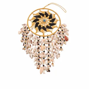 قاب دایرهای پیچیدهشده با نخ مشکی بافتدار بافت داخلی سفید به سبک کلاسیک مهره چشمنظر آبی در مرکز سه آویز پر طبیعی در ترکیب رنگ بنفش و مشکی مهرههای تزئینی سفید در محل اتصال پرها بند آویز مقاوم و همرنگ با قاب