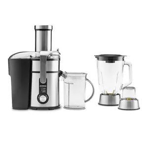 آبمیوه گیری و مخلوط کن 4 کاره، جنس بدنه استیل ضد زنگ، موتور 800 وات همراه با بلبرینگ، دارای 5 سرعت همراه با صفحه نمایش دیجیتال LED، دهانه 75 میلیمتری جهت ورود انواع میوه و مواد غذایی، دارای تیغه استیل ضدزنگ و سبد فیلتر، دارای مخزن تفاله با اندازه 2 لیتر، دارای پارچ مخلوط کن شیشه ای 1/5 لیتری، دارای محفظه شیشه ای خرد کن و آسیاب