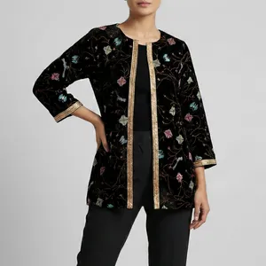 جلوى لباس لايى كوبى شده است و پشت كار و آستين ها از مخمل ساده مى باشد و جلوى لباس مخمل طرحدار مى باشد و دوريقه و آستين ها با نوارهاى سفيد تزيين شده است