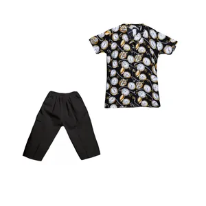 پیراهن آستین کوتاه و جلوی لباس دکمه دارد