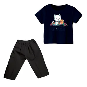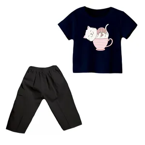 ست تی شرت و شلوارک دخترانه مدل گربه کد ۴ رنگ سورمه ای