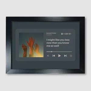 تابلوی موزیکال با طراحی مدرن و الهام‌گرفته از موسیقی، ترکیبی از هنر و احساسات، با نمایش بخشی از متن آهنگ و قاب ساده و مینیمالیست، گزینه ای عالی برای هدیه ای متفاوت و یا دکوراسیونی گفتگو‌آفرین، مناسب عاشقان موسیقی، دارای بارکد اسپاتیفای که با اسکن آن (از طریق اپلیکیشن اسپاتیفای) میتوان به آهنگ مورد نظر دسترسی پیدا کرد.