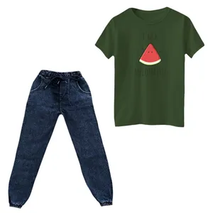 جنس تیشرت پنبه یکرو درجه یک میباشد و به هیچ عنوان پرز پرز نمیشود . جنس شلوار لی نازک کشی میباشد و در قسمت کمر و مچ کشدوزی شده است . چاپ روی تیشرت دیجیتال برجسته و فوق العاده با کیفیت میباشد و به هیچ عنوان کنده و یا ترک ترک نمیشود.