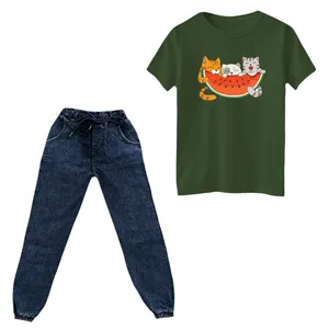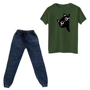جنس تیشرت پنبه یکرو درجه یک میباشد و به هیچ عنوان پرز پرز نمیشود . جنس شلوار لی نازک کشی میباشد و در قسمت کمر و مچ کشدوزی شده است . چاپ روی تیشرت دیجیتال برجسته و فوق العاده با کیفیت میباشد و به هیچ عنوان کنده و یا ترک ترک نمیشود.
