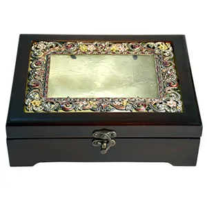 جعبه جواهرات وارداتی مدل لینی .متریال استفاده شده از چوب و فلز، که بدنه آن چوبی و درب آن فلز از نوع پیوتر که با نگین کاری ظریف و زیبا تزیین شده و داخل جعبه جواهر از پارچه ساتن خیلی خوش رنگ که باعث زیبایی هر چه بیشتر این محصول گردیده با خرید این جعبه جواهر زیبایی را در منزل خود به ارمغان آورید