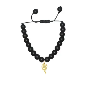 دستبند آسانسوری بندی با نخ مرغوب و سنگ عقیق خزه ای با پلاک گل نگین دار طلایی