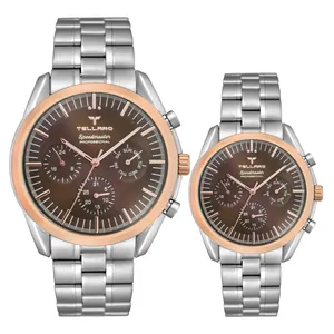 ساعت های ست tellaro یک اکسسوری بسیار شیک و جذاب کلاسیک مخصوص شیک پوشان می باشد و تنوع بسیار زیادی دارد. برند مشهور tellaro یک شرکت تولید کننده انواع ساعت متعلق به کشور چین می باشد.اما اصالت این برند و طراحی آن متعلق به کشور ایتالیا میباشد تنوع بسیار زیاد و کیفیت مطلوب محصولات به ویژه انواع ساعت ست از این برند، سبب محبوبیت آن به ویژه در کشورهای خاورمیانه است. جالب است بدانید،موتور بکارگیری شده در ساعت های مچی برند tellaro ساخت کشور ژاپن می باشد. کشور ژاپن در عرصه تولید انواع ساعت و موتور ساعت در سراسر جهان شهرت زیادی دارد. ترکیب ظاهر کلاسیک با تلفیق تکنولوژی مدرن یکی از اصلی ترین دلایل محبوبیت ساعت مچی های این برند ایتالیایی می باشد. تلارو با ارائه طرح ها و مدل های بسیار متنوع ساعت مچی توانست در کمترین زمان بین هموطنان عزیزمان محبوبیت زیادی پیدا کند. صفحه نمایش اکثر مدل های ساعت مچی های ست برند tellaro به شکل دایره می باشد. نوع کارکرد این ساعت ها از طرح کلاسیک الهام گرفته شده و به شکل عقربه ای یا به اصطلاح آنالوگ می باشد. جنس بدنه ساعت های مچی این برند اکثراً از فلز است و خاصیت ضد زنگ دارد. بند این ساعت ها از جنس استیل ضد زنگ یا چرم مصنوعی درجه یک و شیشه آن هاردلکس می باشد که ظاهری بسیار جذاب و شیک دارد که بسیار مقاوم هستند. نمایش تاریخ، کرونوگراف، سرعت سنج از جمله امکانات این ساعت ها هستند. قفل بند آن ها نیز تاشو با محافظ است. رنگ پس زمینه صفحه نمایش این ساعت های مچی نیز دارای طرح ها و زیبا و متنوع است و رنگ هایی مانند سفید، طلایی و نقره ای دارد. نوع بند و نوع قفل یکی از مهمترین ویژگی هایی است که هنگام خرید ساعت مچی باید به آن توجه داشته باشید. ساعت های دارای بند فلزی به صورت قفل مخفی فشاری و ساعت های بند چرمی به صورت بندینکی بسته می شوند. هنگام خرید ساعت به سایز مچ و رنگ پوست توجه داشته باشید و نوع بند و رنگ ساعت را بر این اساس انتخاب نمایید