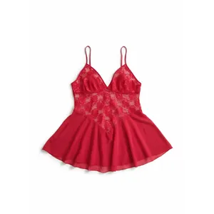 این لباس خواب با طراحی خاص و اغواکننده، جلوهای لطیف و در عین حال جسور دارد. پارچهی توری نازک آن با بافت مشبک منظم، سبک و خنک است و حالتی نیمهشفاف دارد که به آن جلوهای فریبنده و زنانه میبخشد. قسمت بالاتنه با دانتل گلدار تزئین شده که ظرافت طراحی را دوچندان کرده است. یقهی V عمیق لباس، به همراه برش دقیق در بخش سینه، باعث ایجاد فرم زیبا و کشیدهتر برای بالاتنه میشود. بندهای نازک و ساتنی که قابلیت تنظیم دارند، علاوه بر زیبایی بصری، به راحتی لباس کمک میکنند و بهخوبی روی بدن مینشیند. برش آزاد و نسبتا گشاد دامن لباس، تا بالای ران امتداد یافته و با لبههای موجدار نرم، حس سبکی و جریان آزاد هوا را در هنگام پوشیدن منتقل میکند. رنگ قرمز زنده و براق آن، جلوهای جسور و شیک به لباس داده و در نور، زیبایی خیرهکنندهای ایجاد میکند. این طراحی با تمرکز بر راحتی، سبکی و زیبایی ظاهری، یکی از بهترین انتخابها برای تجربهای متفاوت و خاص در زمان استراحت یا مناسبتهای عاشقانه است.