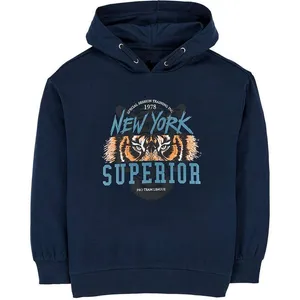 هودی پسرانه با یقه کلاه دار و آستین بلند از پارچه ضخیم با سه شاخه نخ ساخته شده است. جلوی آن چاپ شده و جیب های کانگورو دارد.