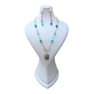 سنگهای استفاده شده در این ست، از جنس سنگ های طبیعی یشم جید آبی رنگ است که در مدال گردنبند این سنگها با رزین پوشانده شده اند.