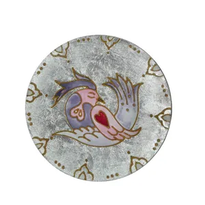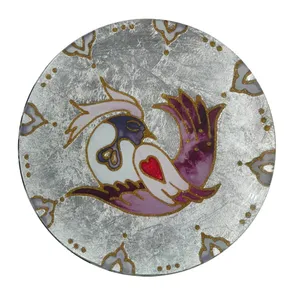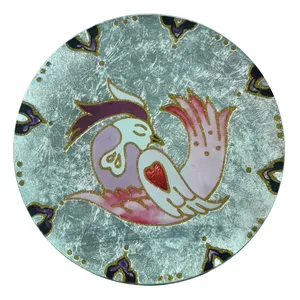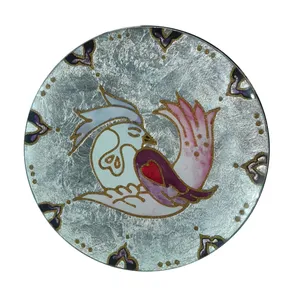 بشقاب شیشه ای که با هنر دست طراحی و رنگ امیزی شده است. بشقاب شیشه ای دایره ای شکل به قطر ۱۸.۵ سانتی متر و ارتفاع ۲ سانتی متر میباشد .
