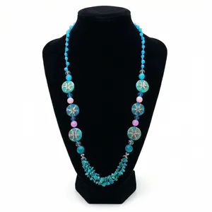 گردنبند دست ساز زنانه که از سنگهای زیبای کارنلین وجاسپر تهیه شده است. سنگ کارنلین دارای خاصیت متعادل سازی نیروهای بدن است و بخاطر رنگ نارنجی شفابخش وشادی آوراست.جاسپر فیروزه ای هم موجب کاهش انرژیهای منفی شده وآرامش درونی را به ارمغان می آورد و بدلیل رنگش آرامش بخش بوده واسترس را ازبین میبرد.این سنگها مناسب متولدین ماههای فروردین، اردیبهشت ،شهریوروبهمن ماه میباشند.
