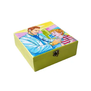 جعبه نگه دارنده دارو تهیه شده از چوب ام دی اف 3 میل دو رو رنگی با بهترین کیفیت است. در قسمت لولا این جعبه از پرچ فلزی کار شده است که علاوه بر استحکام بیشتر و زیبایی نسبت به لولای چوبی به شما این امکان را میدهد که درب را در هر زاویه ای نگه دارید. ابعاد کلی این جعبه 20 در 10 در ارتفاع 10 سانتیمتر است. ابعاد به گونه ای طراحی شده است که انواع قرص،آمپول،در آن قرار میگیرد. رنگ بدنه این جعبه قهوه ای تیره و رنگ درب رنگی است که شما سفارش میدهید