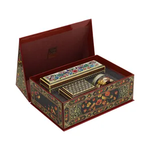 جعبه گلستان: تمامی این اقلام در جعبه هاردباکس مدل «گلستان» با ابعاد ۳۳ در ۲۳ در ۱۱ سانتیمتر چیدمان شدهاند. این جعبه با طرحهای گل و مرغ سنتی و رنگبندی گرم، وقار و ارزش هنری هدیه را تکمیل میکند.