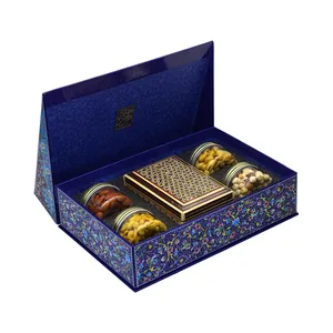 جعبه گلستان: تمامی این اقلام به زیبایی درون جعبه هاردباکس مدل «گلستان» (با ابعاد حدودی ۳۳ در ۲۳ در ۱۱ سانتیمتر) چیدمان شدهاند. نقوش سنتی گل و مرغ و رنگبندی گرم این جعبه، هارمونی فوقالعادهای با رنگهای خاتم و آجیلهای زعفرانی ایجاد کرده است.