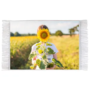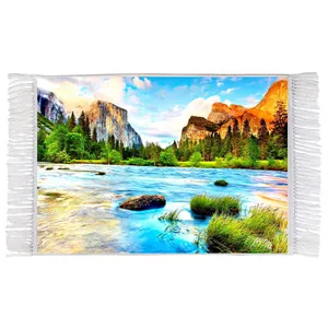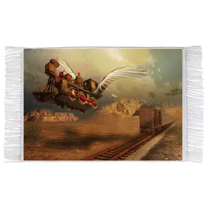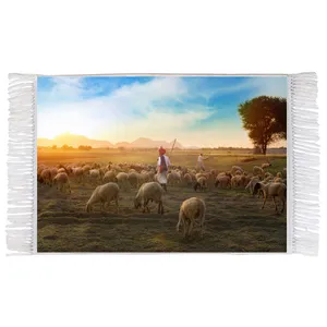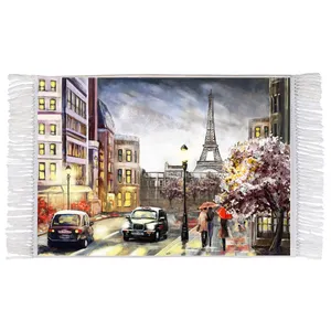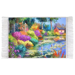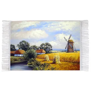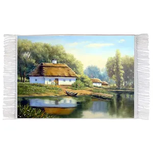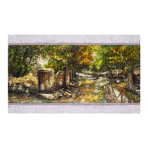 فرش ماشینی دیوارکوب اطلس آبی طرح منظره روستا اسب گاری خانه درخت مدل T1085