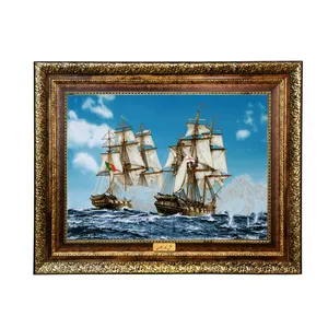 فرش ماشینی دیوارکوب اطلس آبی مدل نقاشی دریا و کشتی و رعد برق مدل T1219